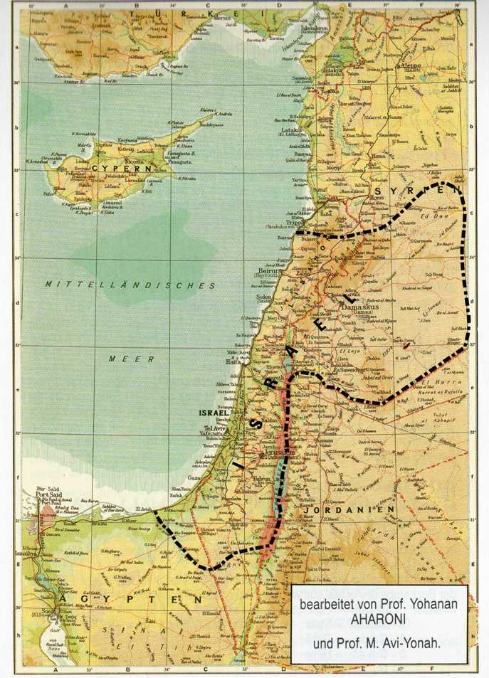 Die territorialen Grenzen sind in folgender Karte von Prof. Yokanan Aharoni und Prof. M. Avi-Yonah, die ich aus dem Israel Jahrbuch von 1995 übernahm, dargestellt.