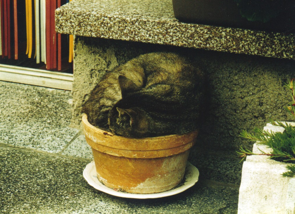 Wir hatten mal eine Katze, welche sich mit Vorliebe auf einen Blumentopf legte. Das ist ein Bild davon.